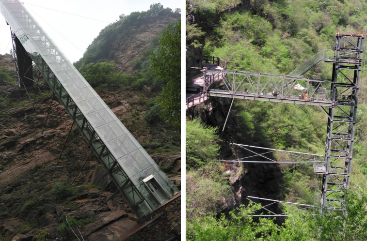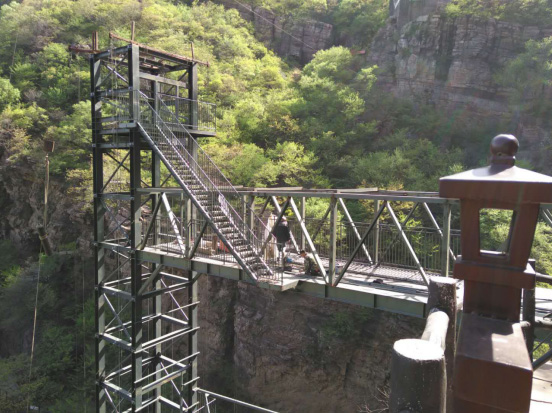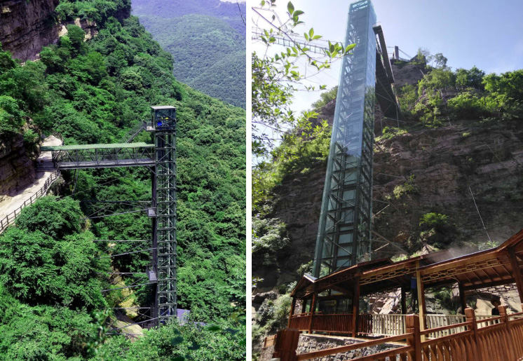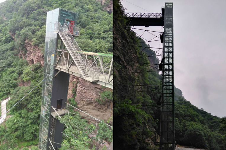 河南省平顶山市灯台架景区钢结构观光电梯,运行高度78米,运行承重量1.6吨,于2017年10月开工,2018年4月1日投入使用。