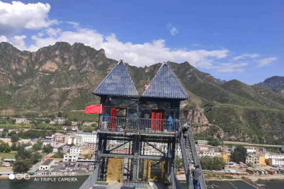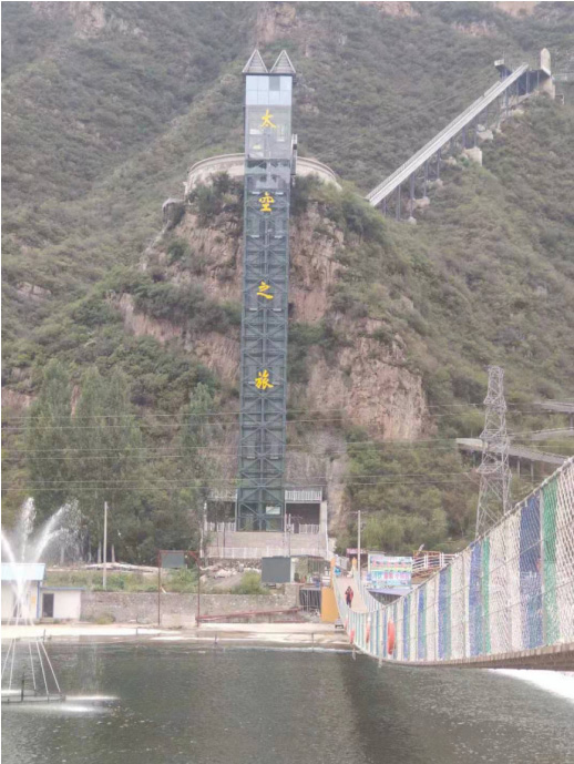 河北省保定市野三坡清泉山景区钢结构电梯,运行高度80米,运行承载重量1.6吨,运行承载人数22人。于2018年11月开工,2019年投入使用。